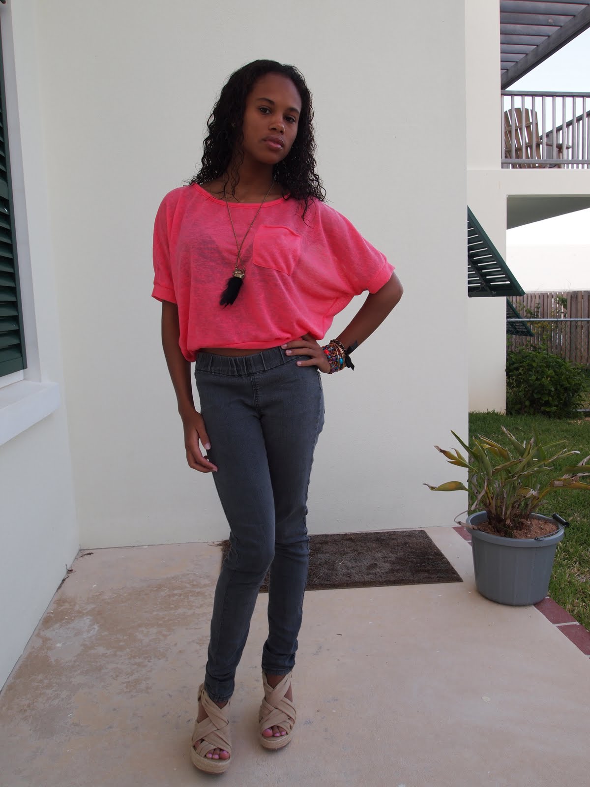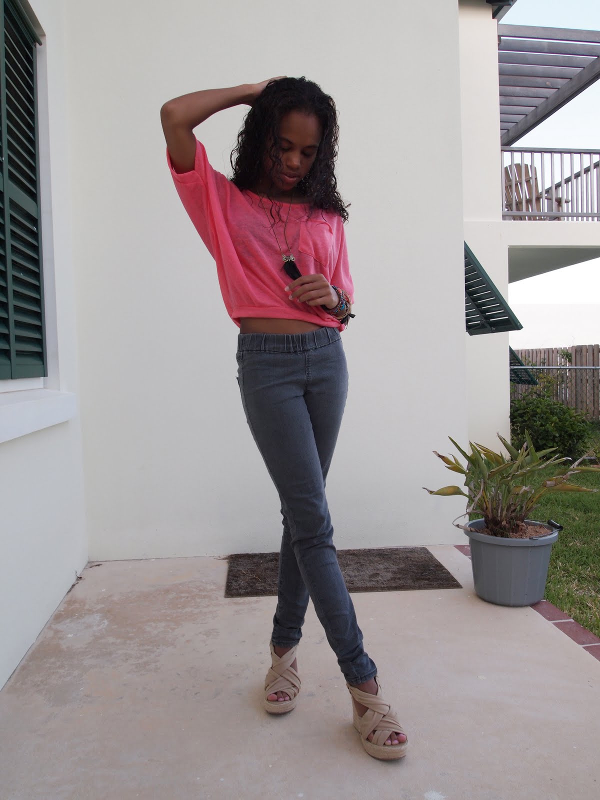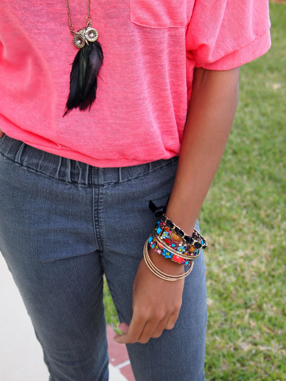 (Forever 21 jeans, bangles, necklace; Aldo floral bracelet; wedges from DSW; top from Pacsun)