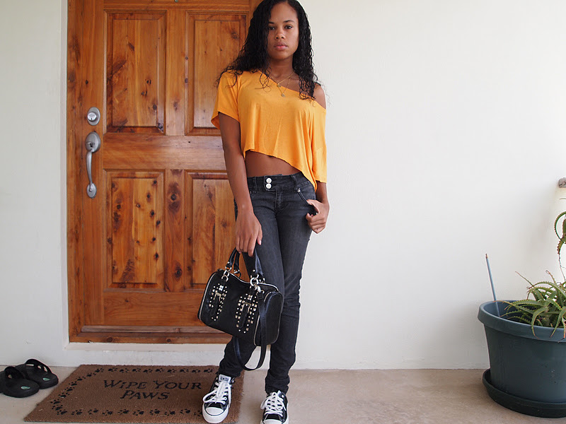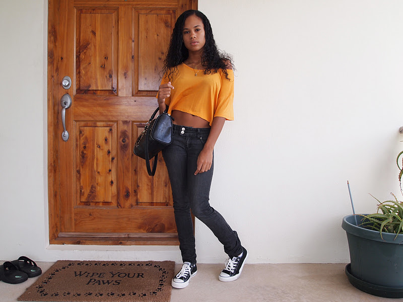 (H&M top; Nine West purse; Converse Chuck Taylors; Forever 21 jeans)