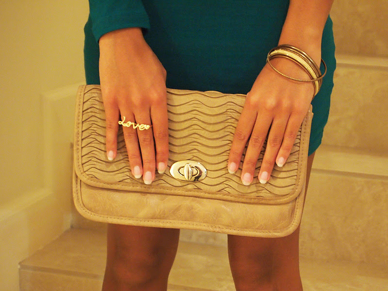 (Forever 21 dress, jewelry, & purse; Call It Spring pumps; vintage beige bangle)