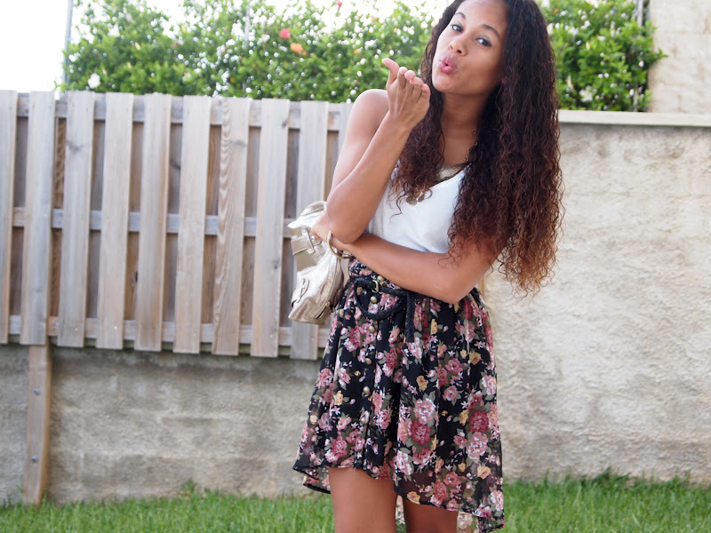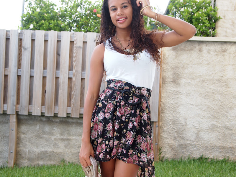 (Forever 21 tank, necklace & bangles; Seductions skirt from Sirens; H&M belt; Mango clutch; Nine West espadrille wedges)