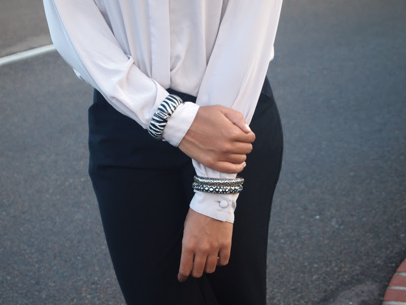 (Thrifted blouse; H&M necklace; Forver 21 bangles; random pants; Bakers pumps; Mango purse)